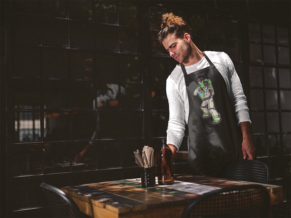 Cocinar con un IRON BUZZ es elevar la gastronomía a otro nivel de sofisticación. Lo verás intentando escanear los ingredientes para detectar niveles de picante o usando su visor para calcular el punto exacto del solomillo con un margen de error de cero. Su mayor problema es que, a veces, se olvida de que no todo el mundo tiene un paladar de vibranium y sus platos pueden tener una «chispa» tecnológica demasiado fuerte. Con este delantal, dejas claro que tu cocina es un laboratorio de sabores donde la innovación y la diversión van de la mano.