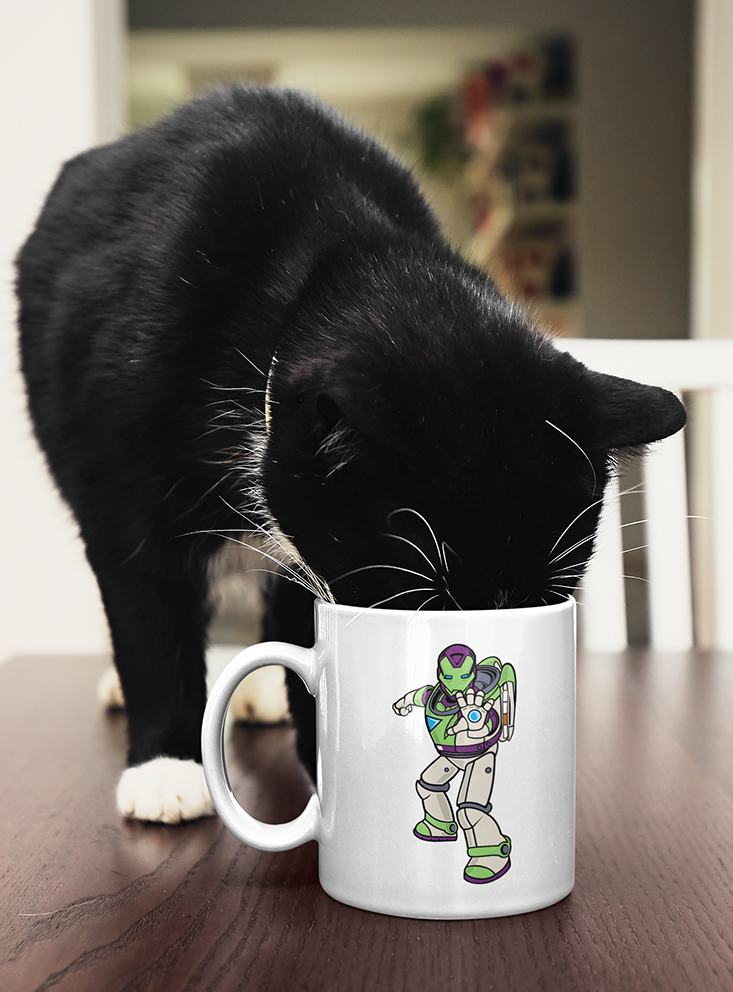 Lo ves en la taza, con el traje de Buzz Lightyear, pero con las líneas y el reactor Arc de Iron Man, y con una pose de lanzamiento de rayo repulsor. Su misión ahora es doble: Ir Hasta el infinito y más allá y demostrar que es el juguete más avanzado de toda la galaxia.