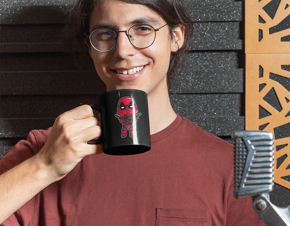 Lo ves en la taza, con el casco de Stormtrooper pintado de rojo y negro, sosteniendo un rifle y sus icónicas katanas. Su misión no es seguir al Emperador, sino sobrevivir a su propia mala suerte, encontrar chimichangas galácticas y asegurarse de que el Imperio no descubra que su «bláster» dispara balas de verdad.